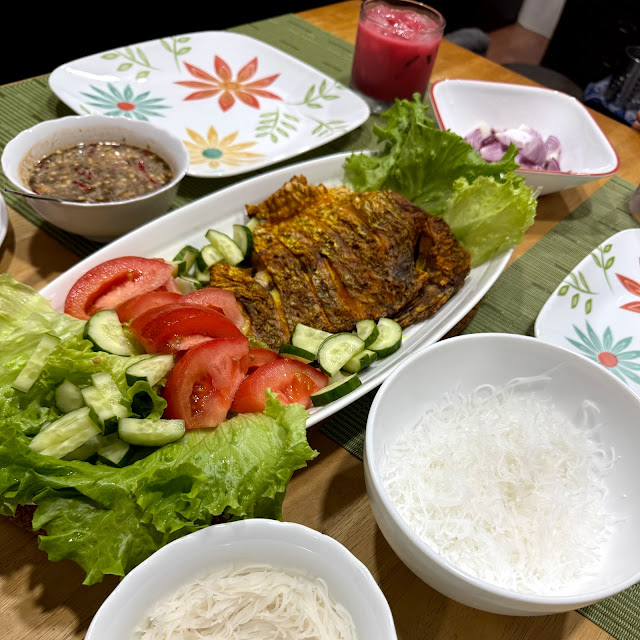 Sepatutnya ikan digoreng tapi malas. Goreng lagi sedap. Air fry ikan sebelah2. Gaul garam kunyit saja. Serve dengan lettuce, timun, tomato, suhun dan sambal cili (kisar 3 cili api, 1 suduteh sos ikan, 1-2 genggam daun sup/ketumbar, 4 sudubesar gula/gula melaka, 3 garlic, jus 3 limau nipis). Sambal cili perasakan ikut suka, ada masam manis pedas masin, sos ikan kena ada kalau nak sedap.
